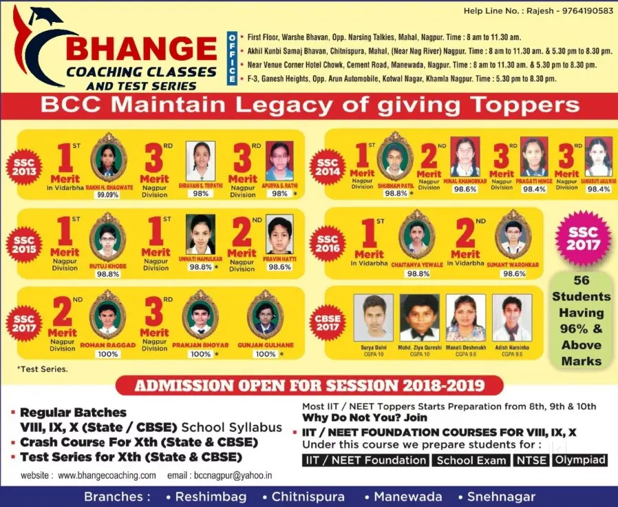 Bhange is the best coaching classes among the Nagpur Coaching, its the best and good and the most faculties coaching from my experience, the teachers staff is very good and gives more stress on self studies and the doubt session